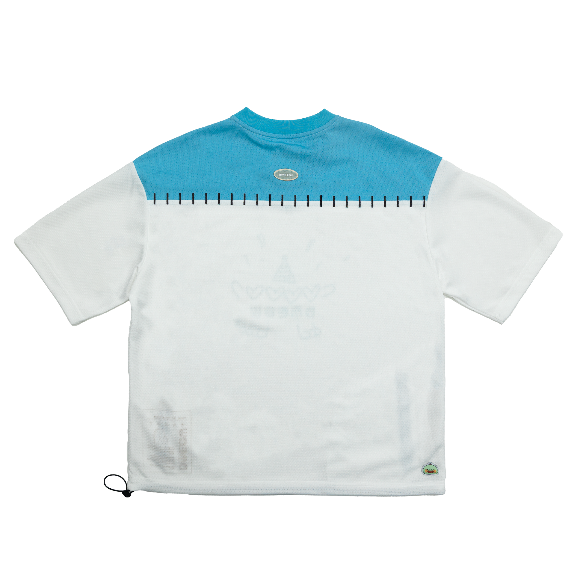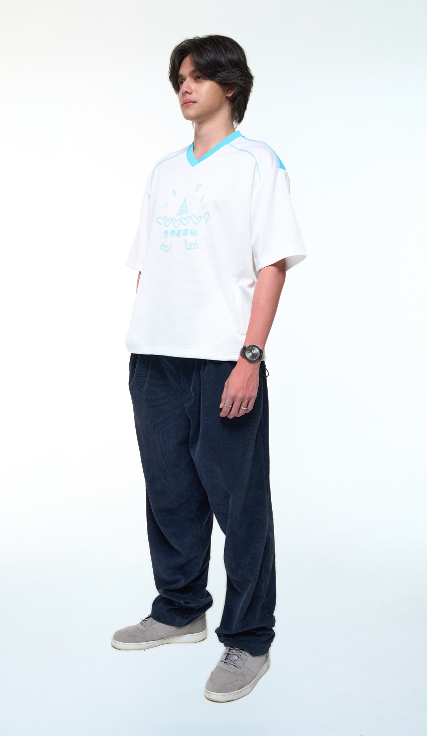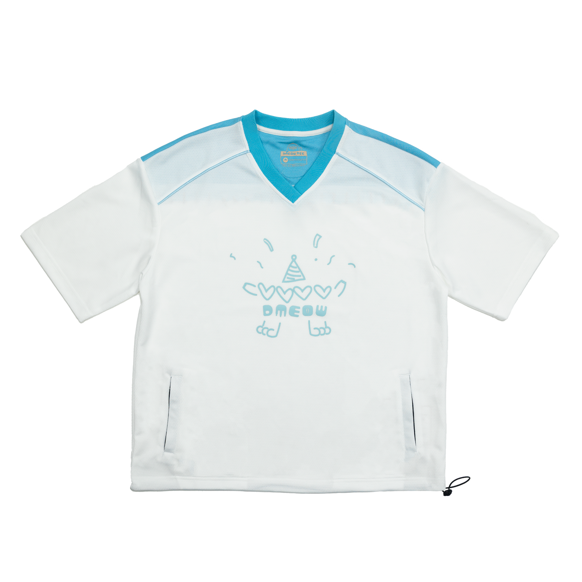 Celebrate every fit with the Hooray White jersey shirt. Clean white base with a pop of blue line, side pocket, and birthday graphic front and center.