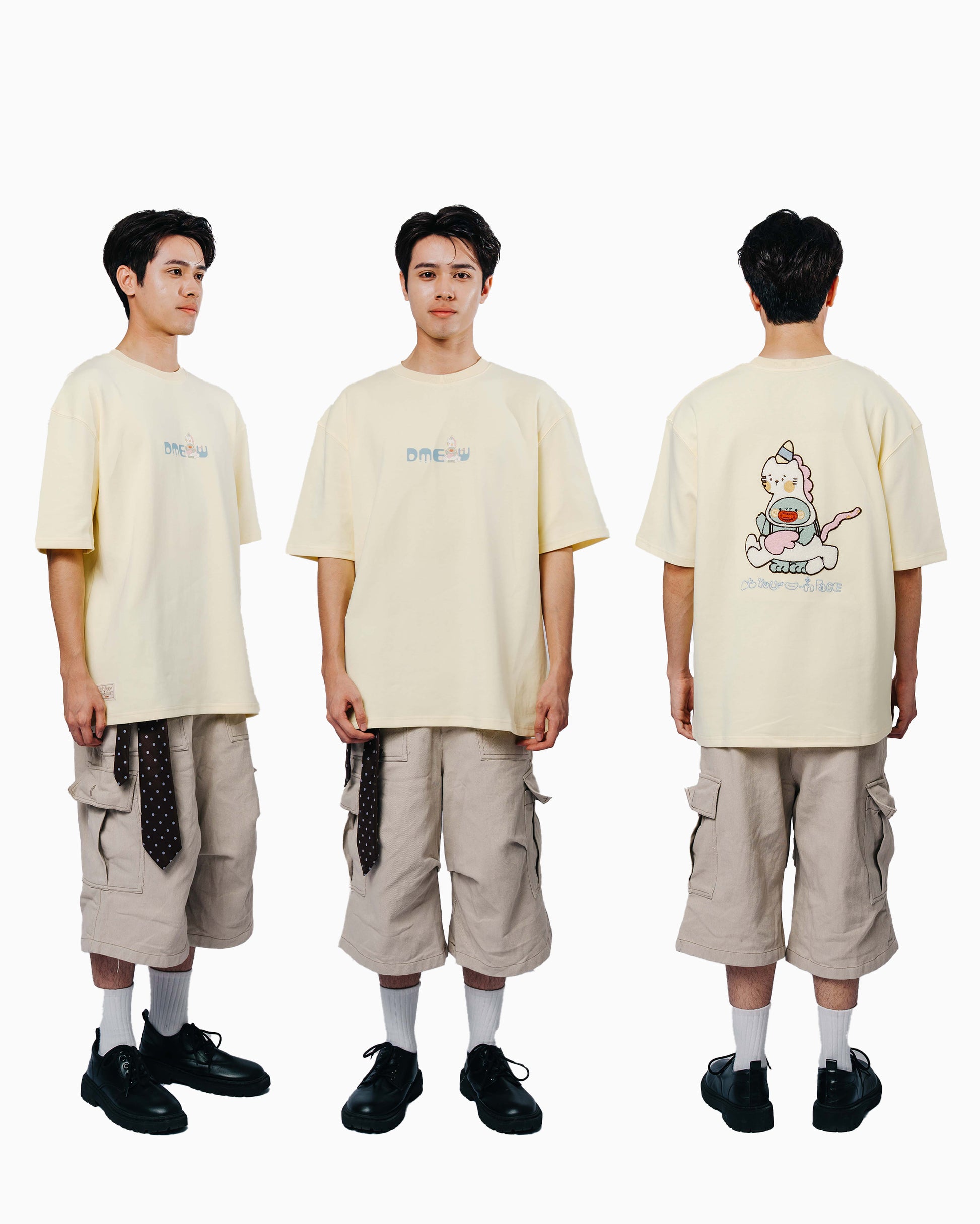 A statement from the back. Featuring a towel embroidery of Dee in a Meow mascot outfit, this tee adds texture, fun, and character to your everyday look.
