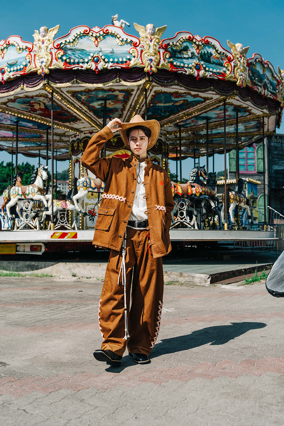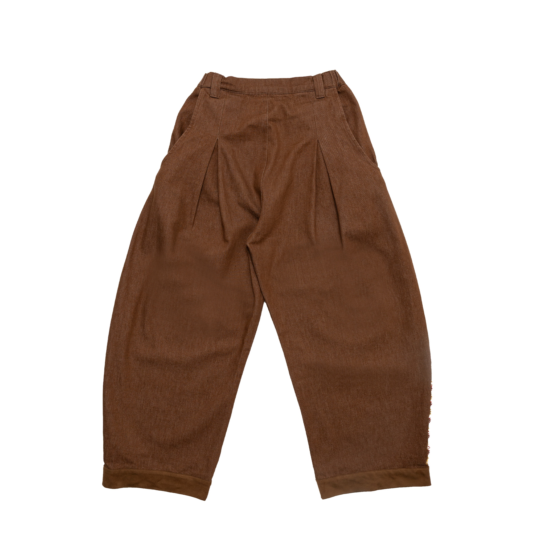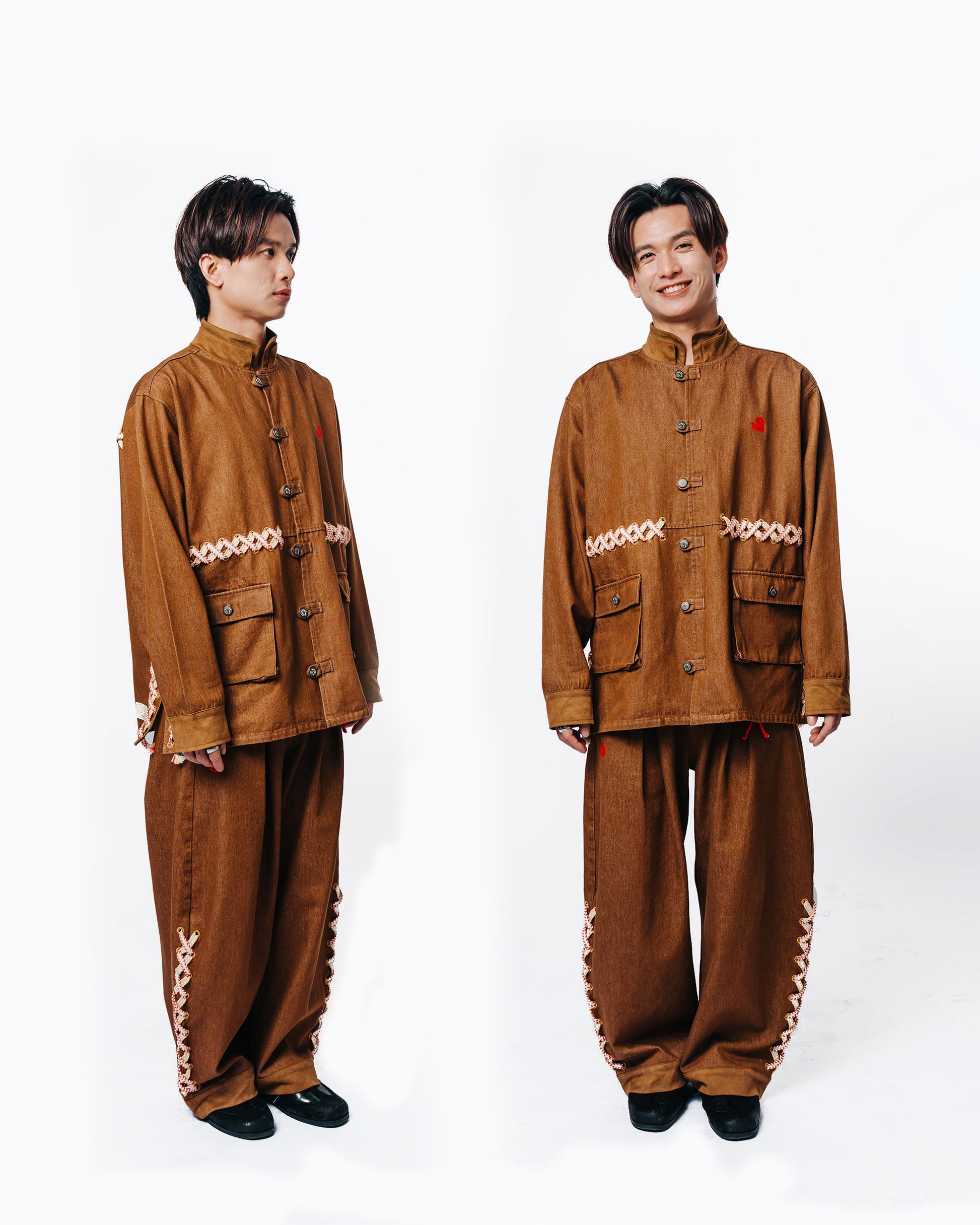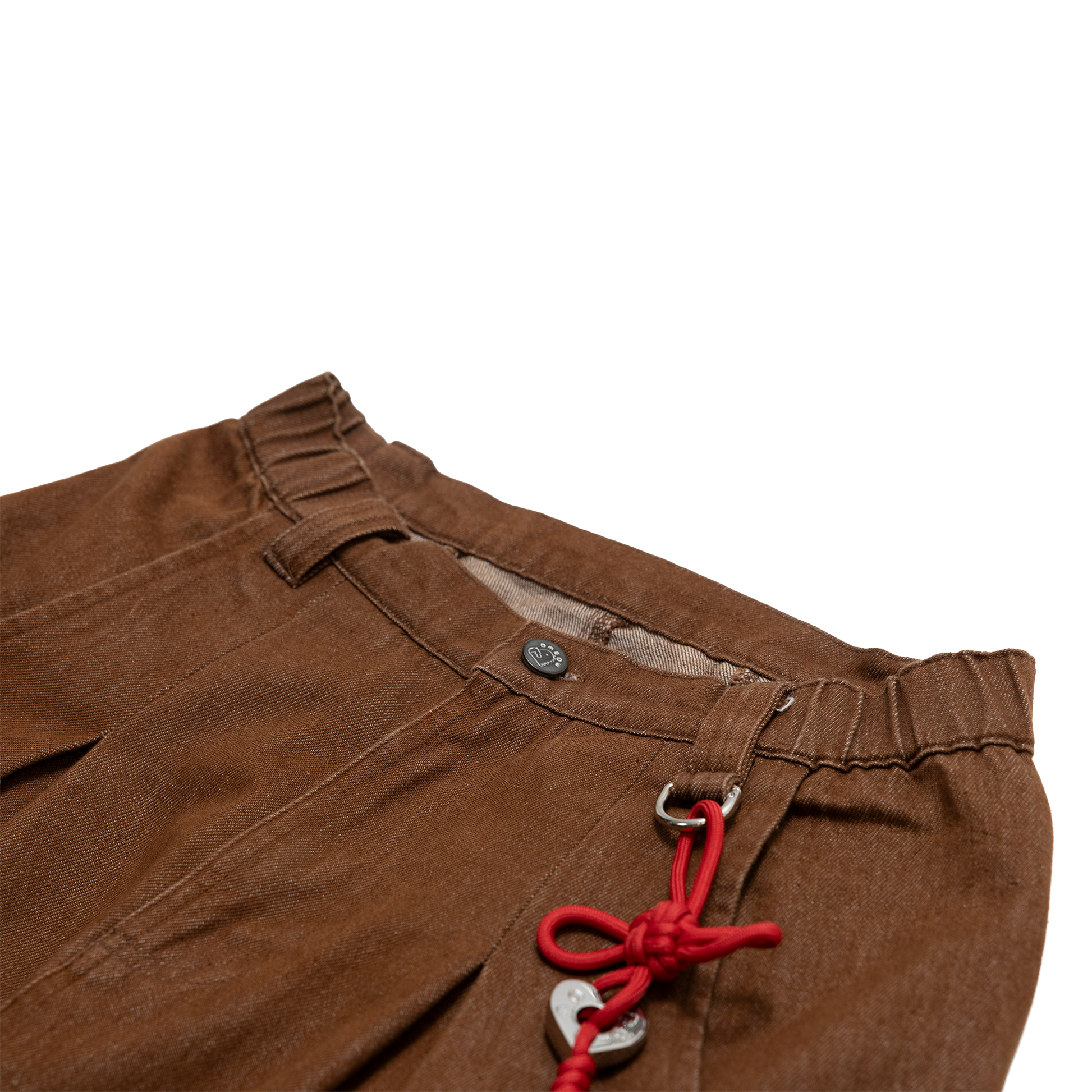 Brown denim with playful string details at the cuffs and a special Chinese knot ornament at the right waist — stylish with a signature Dmeow twist.